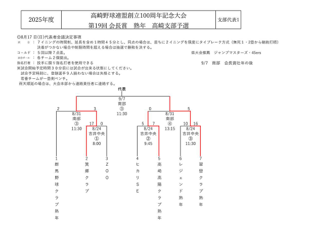 9月14日に行われたR7第32回高崎市長旗争奪熟年野球大会の抽選結果はこちら (決勝戦の日程が11/16(日)に変更となりました)
